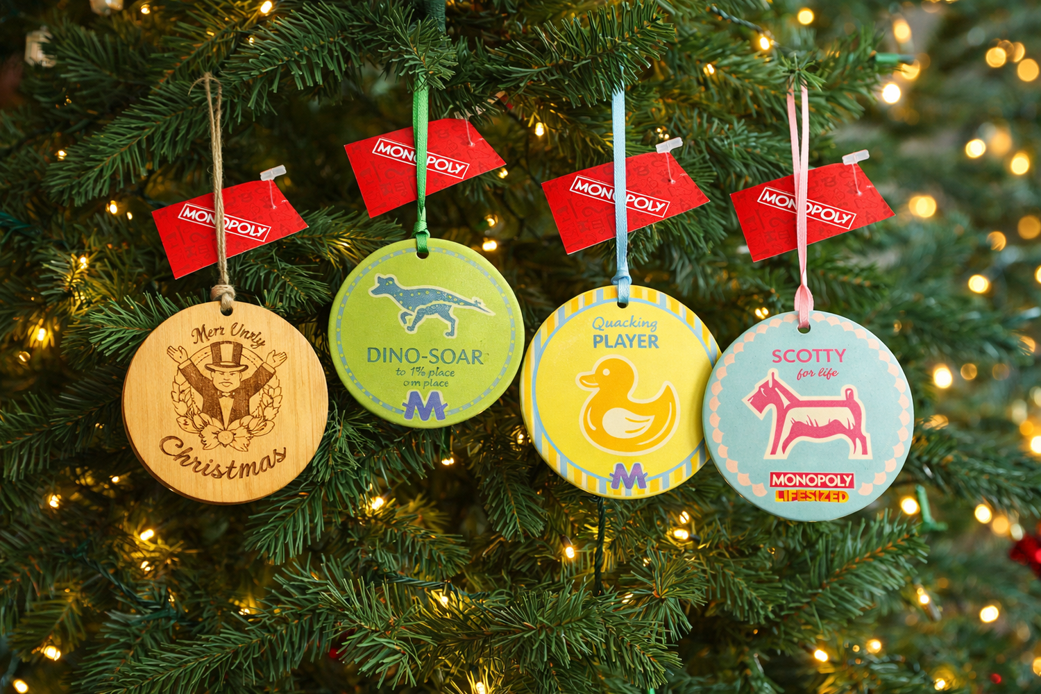 A selection of different Monopoly Christmas Christmas Tree Decorations.